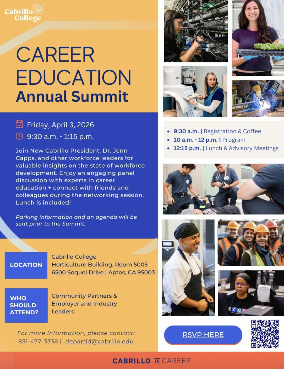 Please join us for the 2026 Career Education Summit on Friday, April 3, 2026, from 9:30 am -1:15 pm in the beautiful Horticulture Center, Rm. 5005 on the Cabrillo College, Aptos campus.