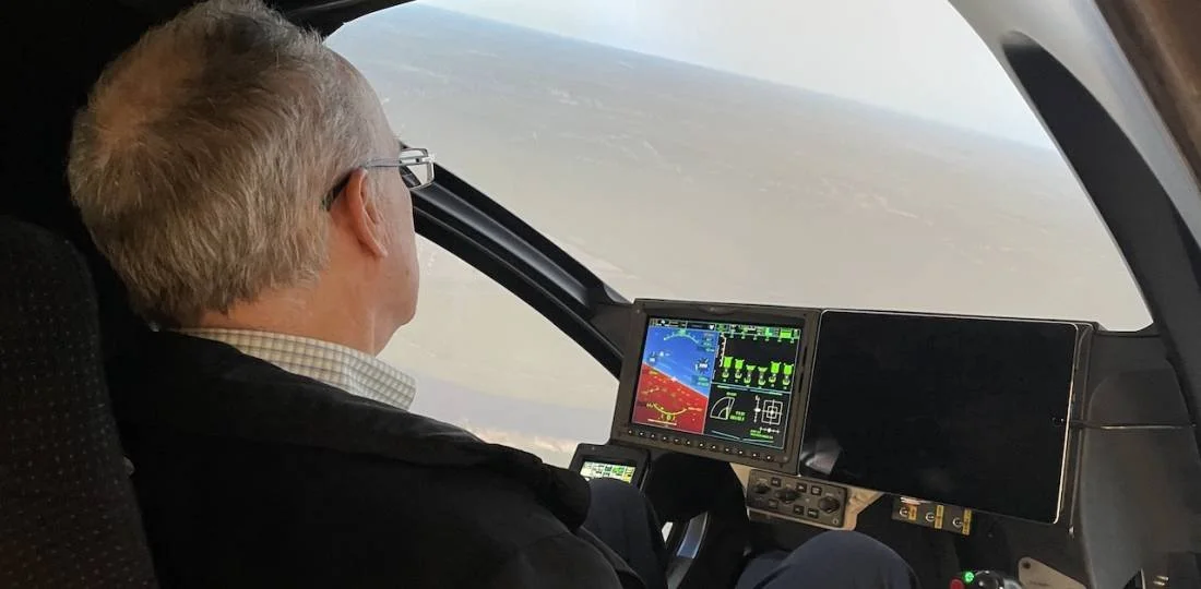 AIN editor-in-chief Matt Thurber trying out the fly-by-wire flight controls in Joby's eVTOL simulator.