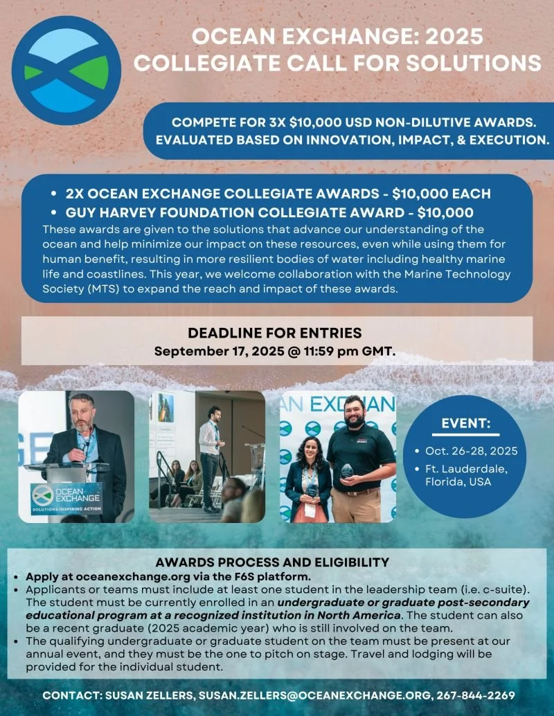 University of California, Santa Cruz students with innovative solutions for ocean, climate, and sustainability challenges are invited to apply for the prestigious Ocean Exchange Collegiate Awards. The competition offers three non-dilutive grants of $10,000 each for student-led startups and projects with the potential for real-world ocean impact and for-profit scalability. The application deadline is September 17, 2025.