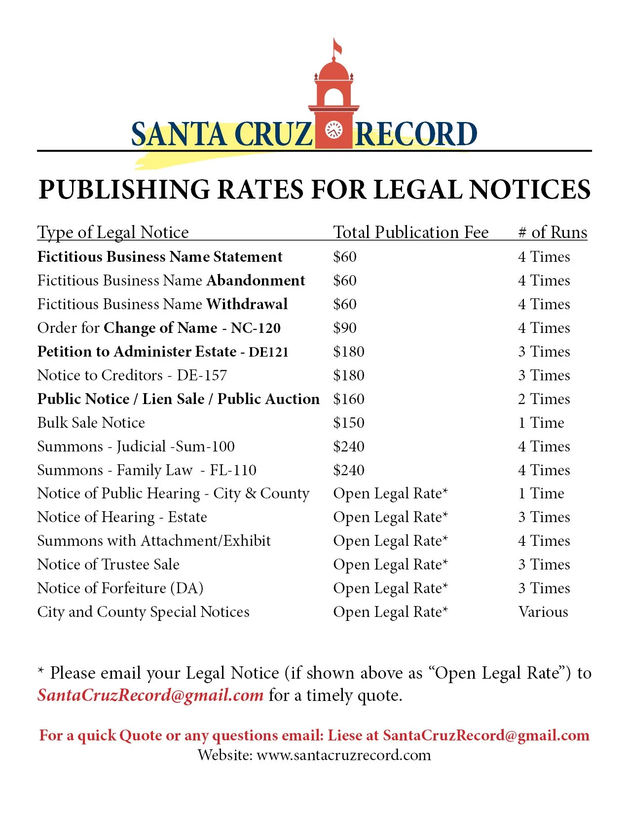 Founded in 1972, the Santa Cruz Record occupies a niche that most entrepreneurs never knew existed — until they need it. It is a legal publishing service and adjudicated newspaper of record serving Santa Cruz County, offering fictitious business name (FBN) publication and a full roster of legal notice services at the most affordable rates in the county.