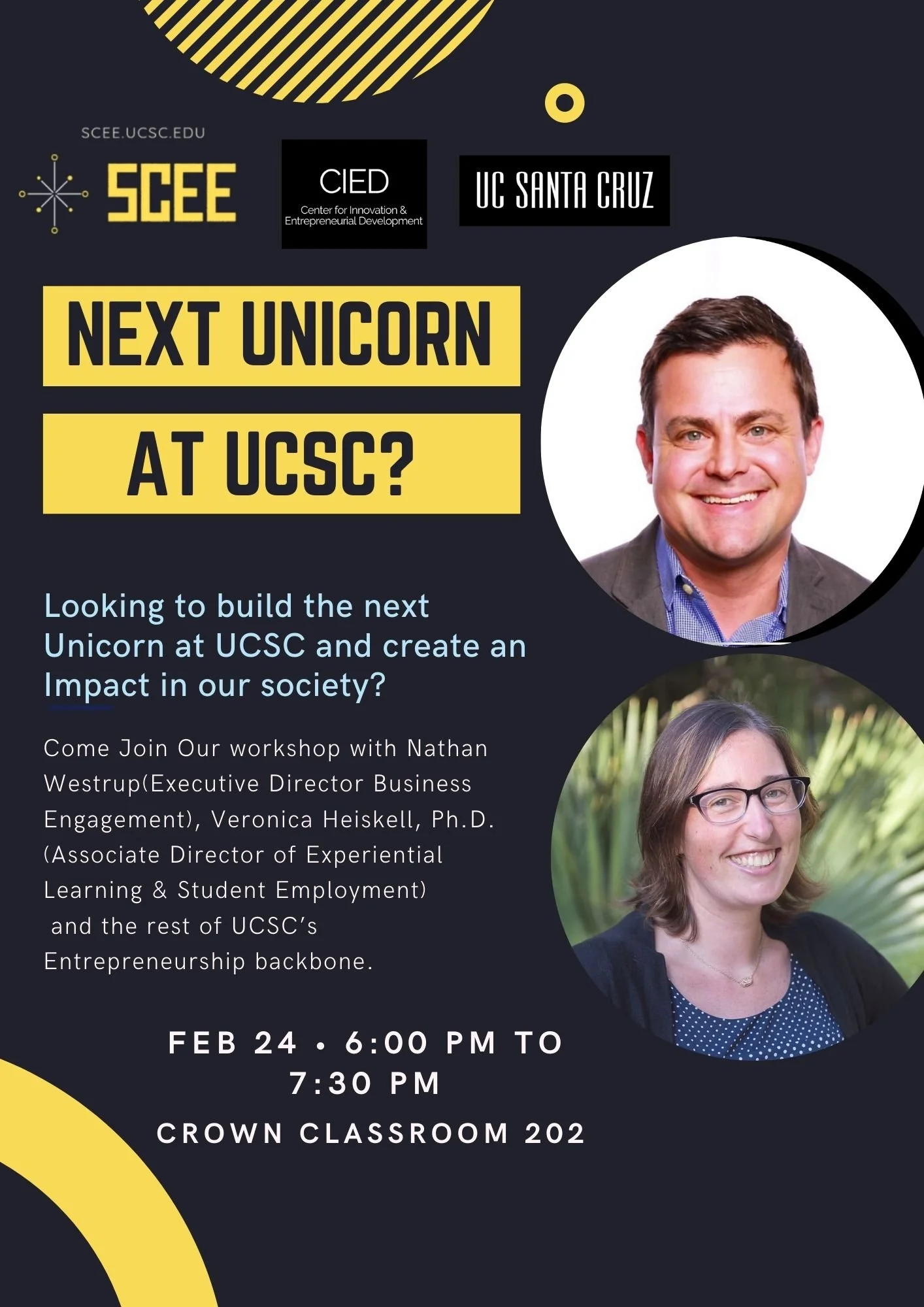 Wanna Build the Next Unicorn at UCSC. Come through this Thursday to Crown Classroom 202 for hearing these amazing speakers, Nathan Westrup and Veronica Heiskill Ph.D.