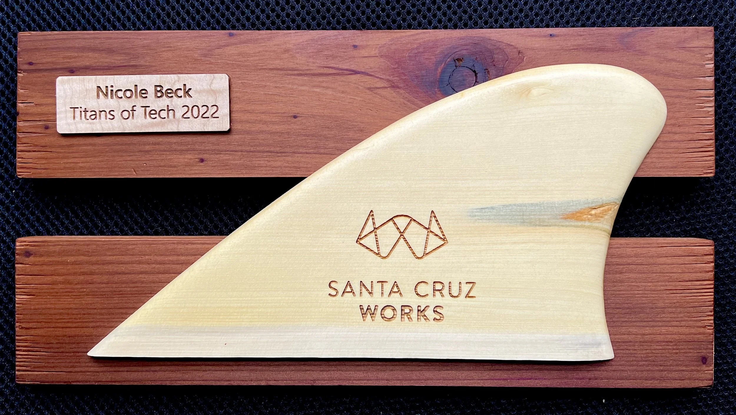 The Titans of Tech 2022 awards were created by Martijn Stiphout of Ventana Surfboards & Supplies. They are made from reclaimed woods that are uniquely related to the Monterey Bay.