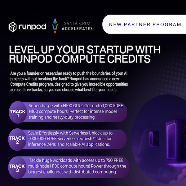 Runpod joins Santa Cruz Works as the AI infrastructure partner for the 2025 Accelerates cohort, supporting founders with GPU-first infrastructure. Together, they’re helping startups move from training to production with speed, clarity, and real-world impact—not just pitch decks.